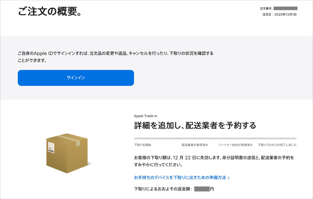 送られてきたメールの「下取りの手続きのために少し情報が必要です」の[配送業者を予約]からApple IDでサインインする。