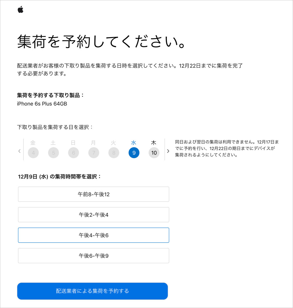 「集荷を予約してください」で集荷日と時間帯を選び予約後、「お客様の下取りの詳細」で予約内容を確認する。