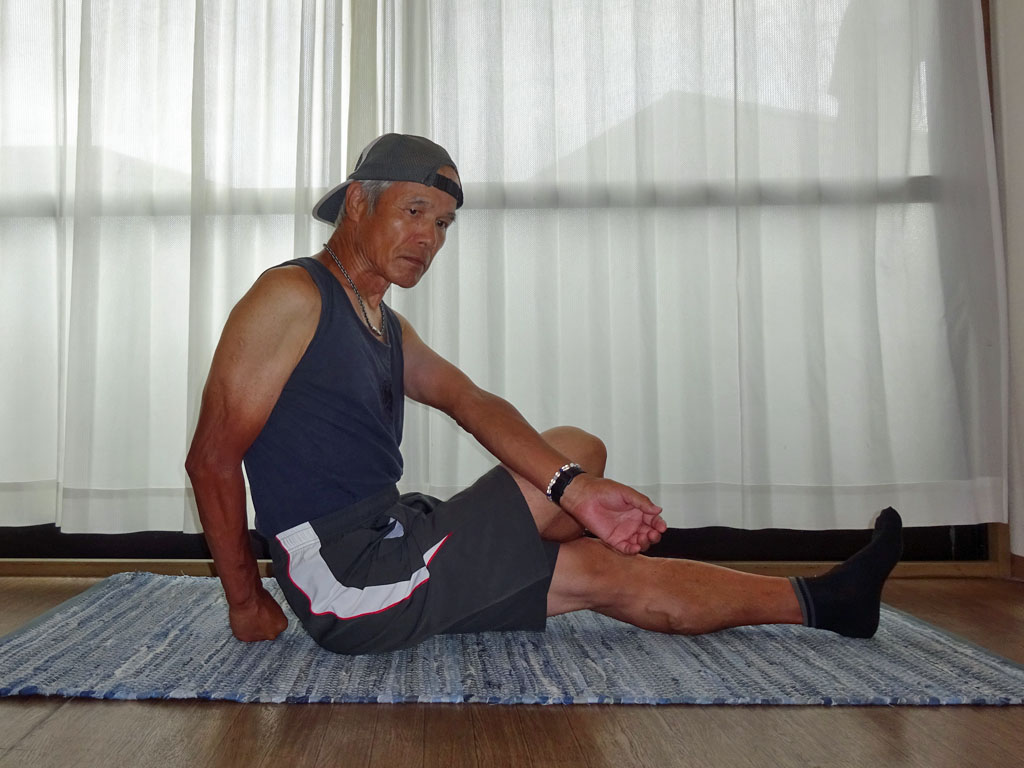 *私が始めたときは右捻じりのとき(写真)、右の坐骨が床に着かず、姿勢の維持もきつかった。骨盤のズレがあったためでしょう。1回60秒で週4〜5回行い、1ヶ月ほどで左右同じ感覚でできるようになりました。