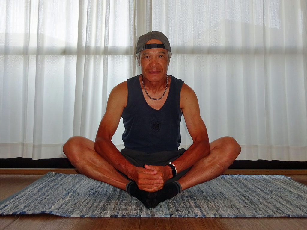 合蹠のポーズ(1分) → 半分の魚の王のポーズ 右(1分) → 半分の魚の王のポーズ 左(1分) → 半分の魚の王のポーズ 右(1分) → 半分の魚の王のポーズ 左(1分)