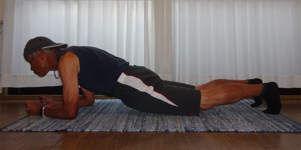 - 両肘を肩幅で床につけ、うつ伏せになる