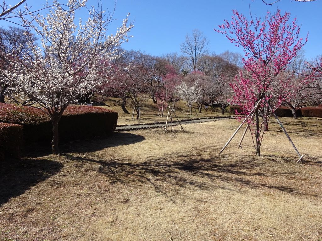 梅園の真ん中あたりの中央通路から東屋周辺を見渡すと、白梅がやや目立ち8・9分咲きといった印象だ。中には咲き始めの木もあり、これから長く楽しめそうだ。