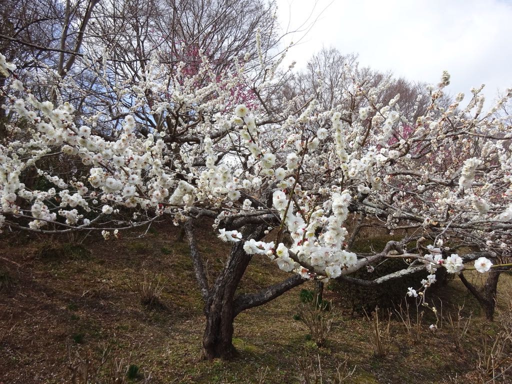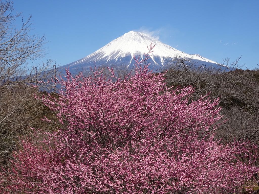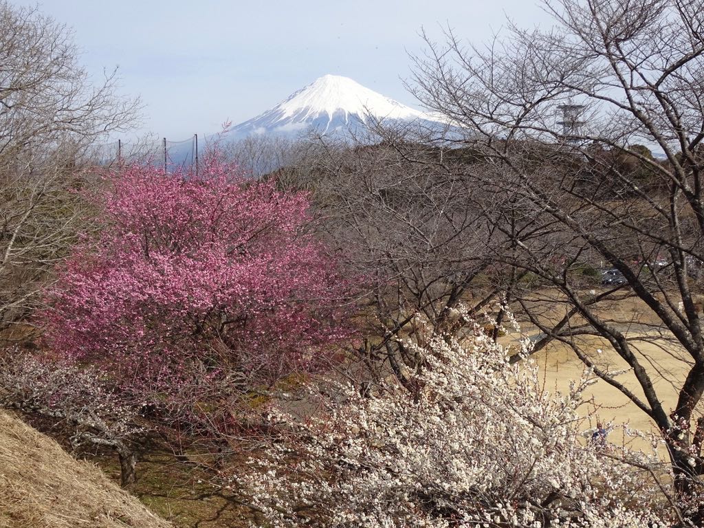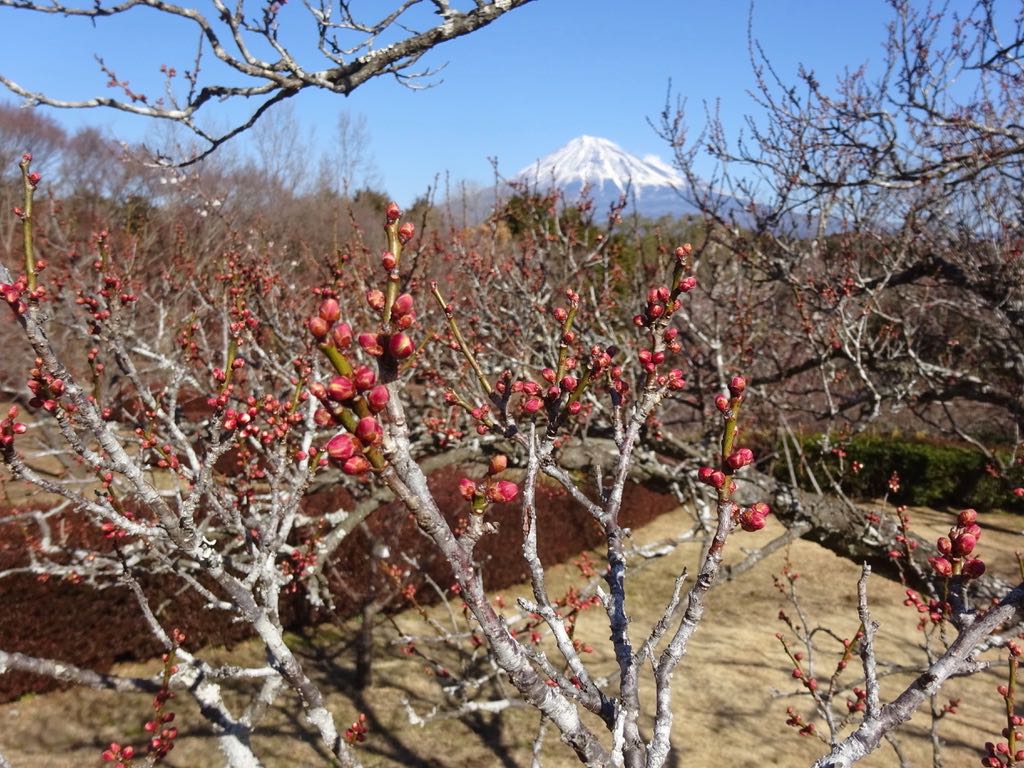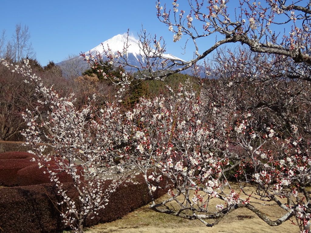 晴れてはいても雲が多めで、富士山はほとんどその雲の中。時折山頂の一部を見せるだけで、梅とのコラボはみられなかったのが残念。
