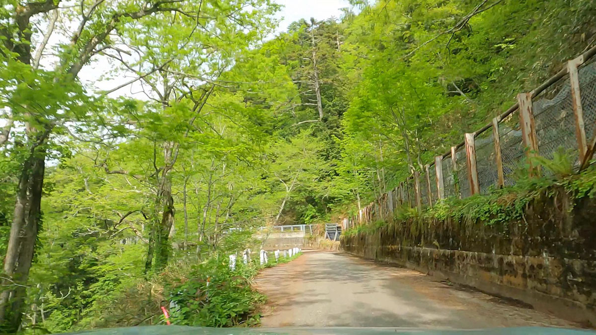 電光掲示板に「安房峠(旧道)通行可能」と表示されている最初のゲートを抜け、瑞々しい新緑の中をユッタリと走る。車線は2車線分あり、対向車があってもすれ違いは容易だ。