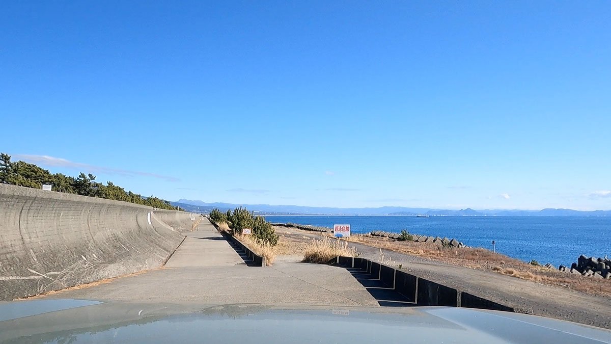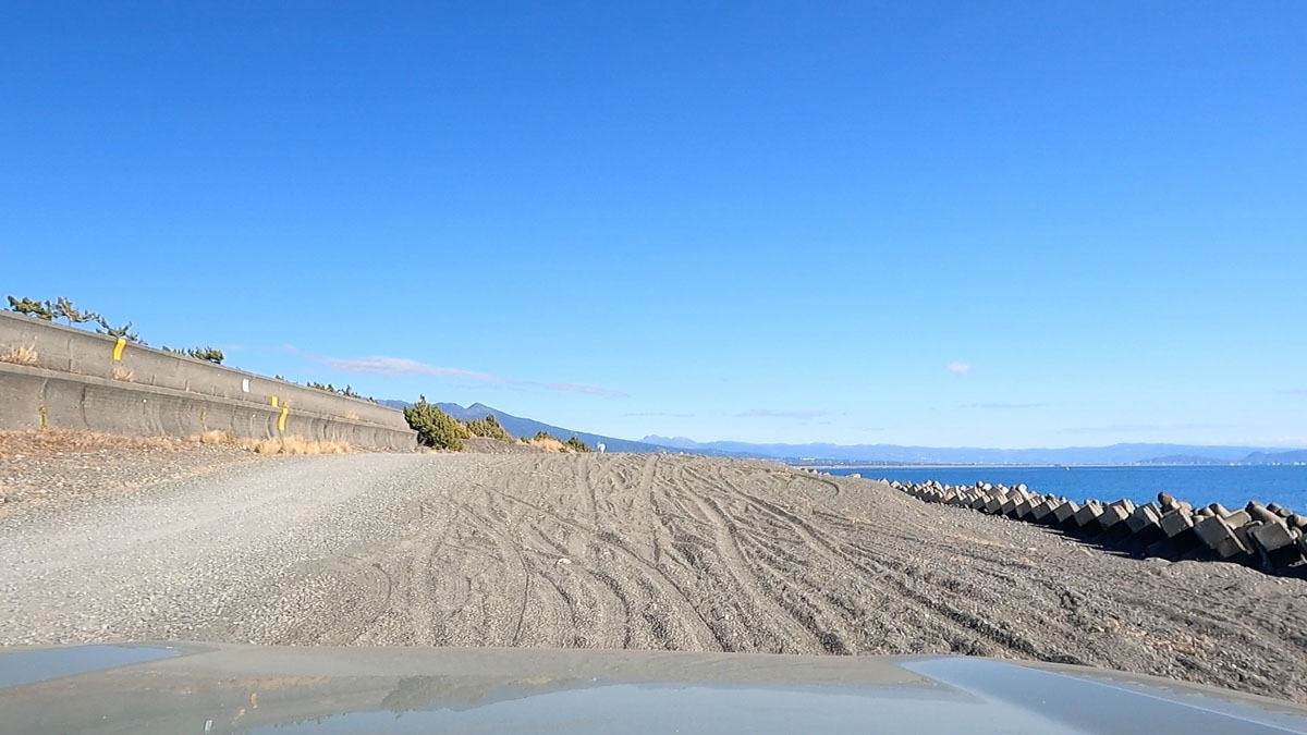 富士川海岸のダートを走った。海岸と言っても、今回走った区間は砂場はほとんどない。砂利や石が浮いているが、路面はしっかりと踏み固められているので、ファミリーカーでも走行は可能だ。