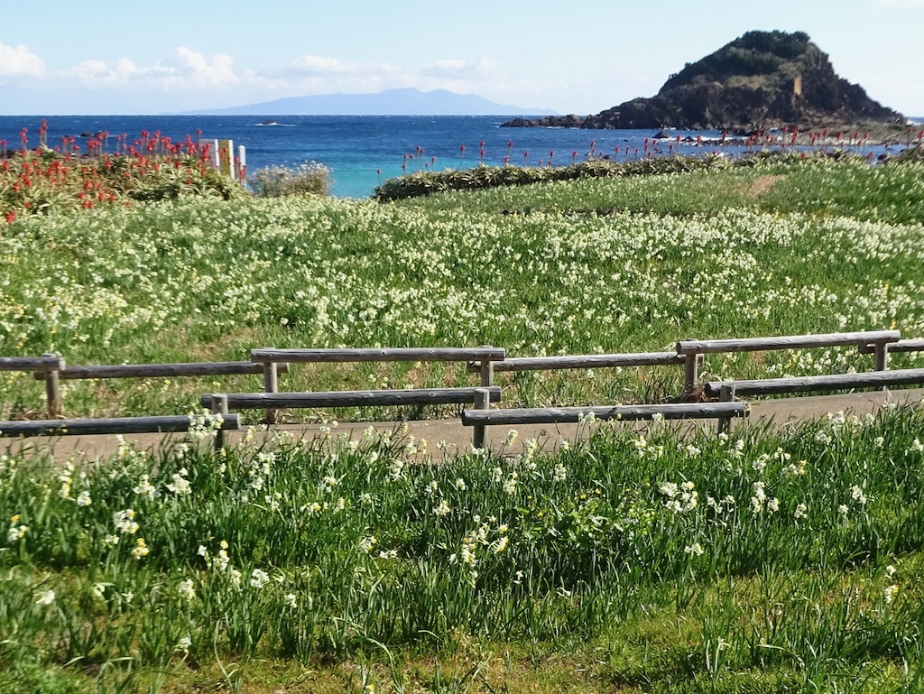 白い水仙の花と赤いアロエの花のコントラスト、その先には洋上に浮かぶ大島が見えている。