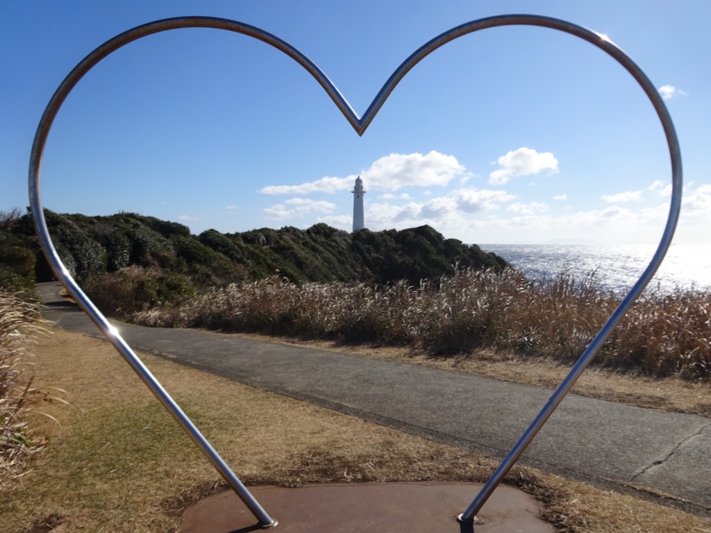 爪木崎灯台は、2017年に日本ロマンチスト協会と日本財団が実施する「恋する灯台プロジェクト」において、「恋する灯台」に認定された。そこでこのハートなのだろう。