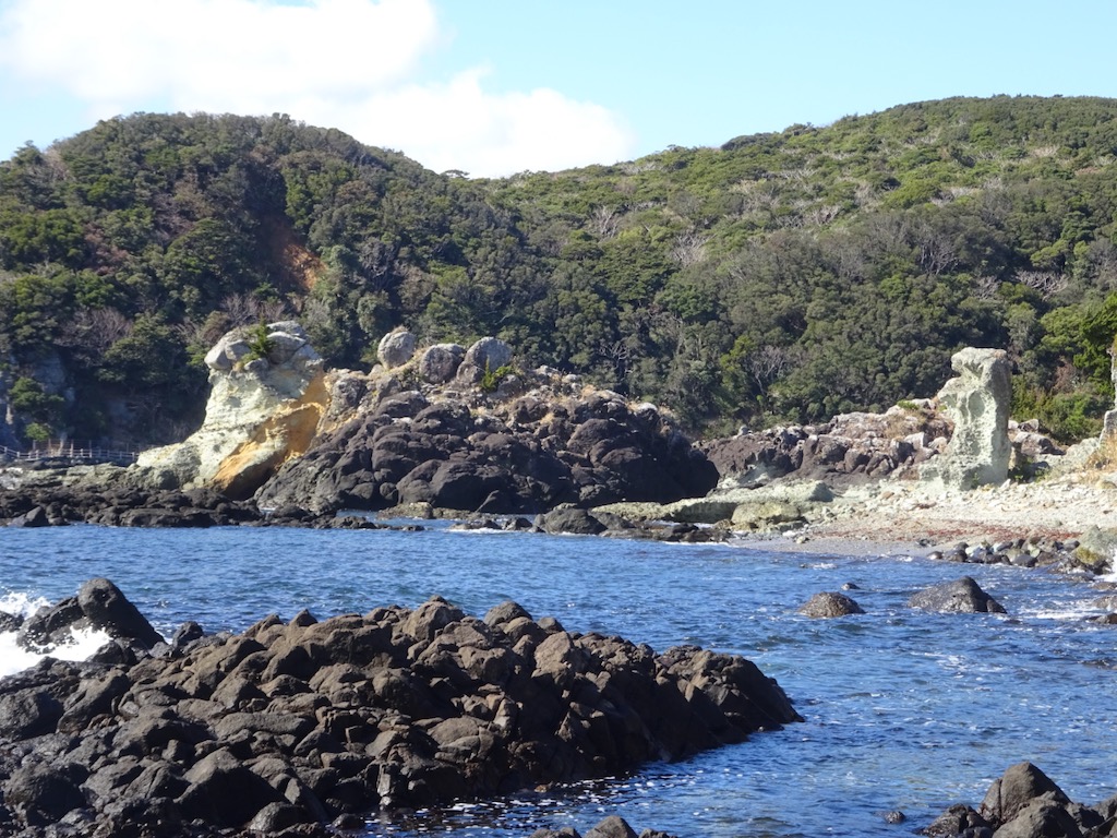 中には入れないため周囲をグルッと回ってみた。東の沖合には伊豆七島の大島や利島、鵜渡根島、新島、式根島、南の沖合10kmには歴史ある神子元灯台が太平洋上に浮かび、北側には天城山が横たわる。また、西の眼下には、荒波に洗われる柱状節理が見られる。