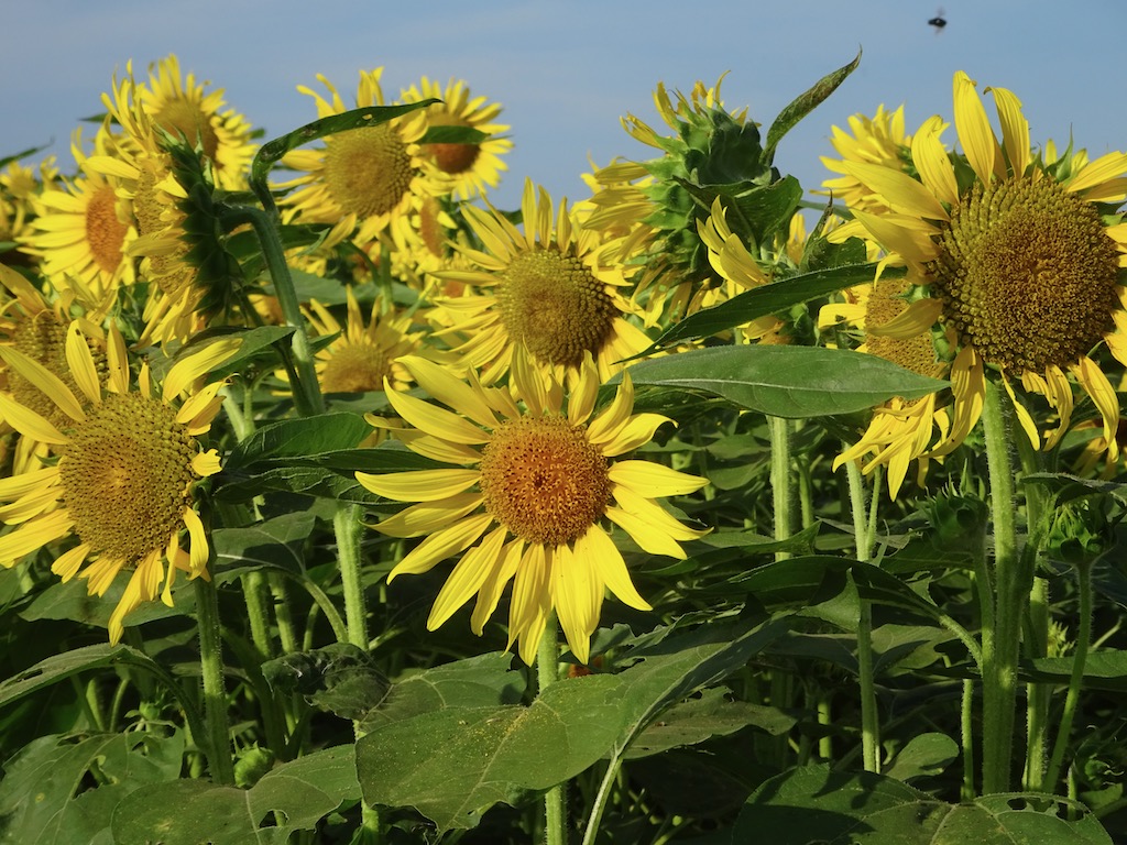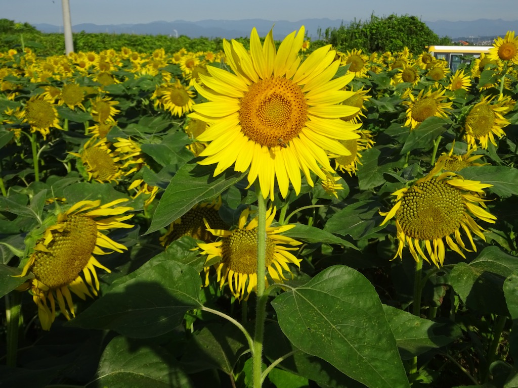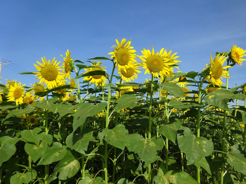 花は小振りとは言え、ひまわりはひまわり。畑一面を覆い尽くす黄色い花は、なかなか見応えがあります。